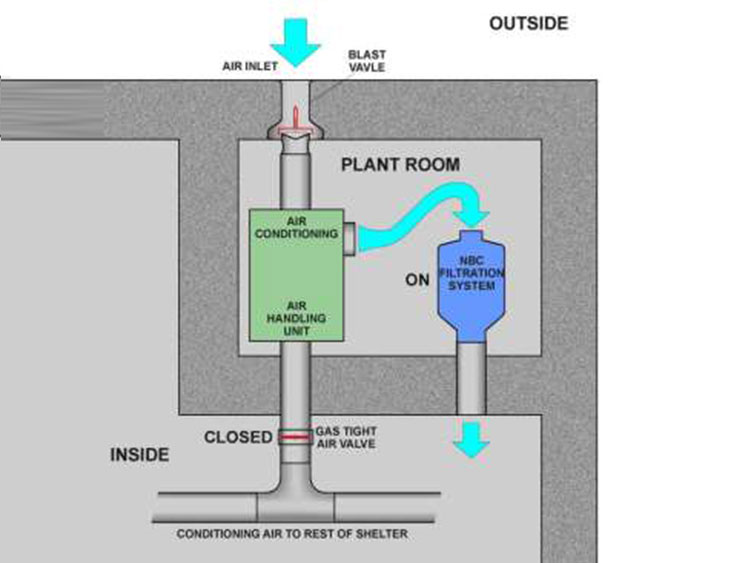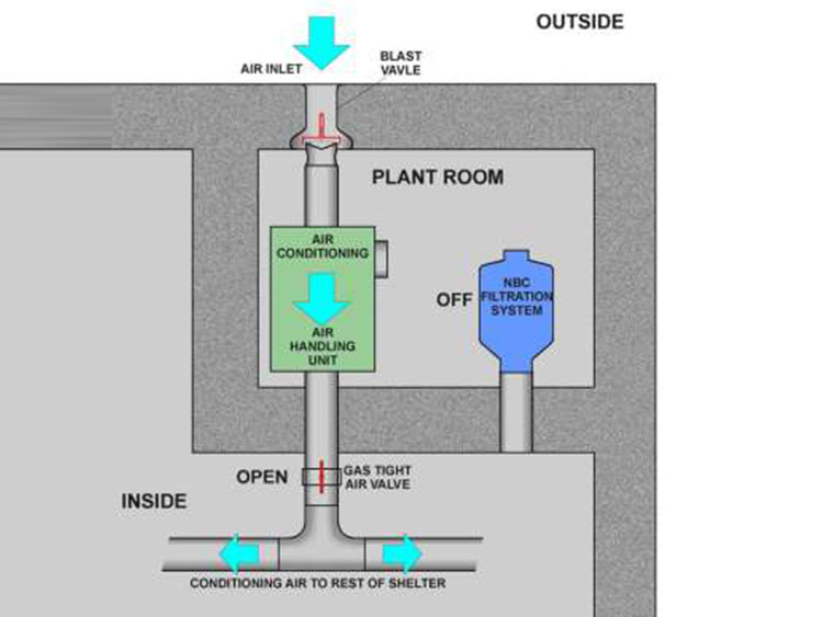The air-conditioning system can continue to be used but the plant room will be sealed and the air to the rest of the shelter filtered through the NBC system.