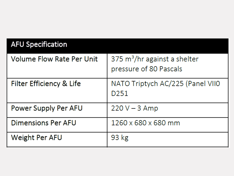 Depending on the size of the shelter will determine the number of AFU’s (Air Filtration Units) required. Multiple AFU’s can be mounted in steel frames for large shelters.