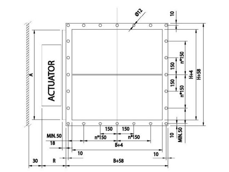 These shut-off, gas and balancing dampers meet international standards for rectangular (width B 100-1200 mm and height H 100-1600 mm, 1 mm division) ducts.