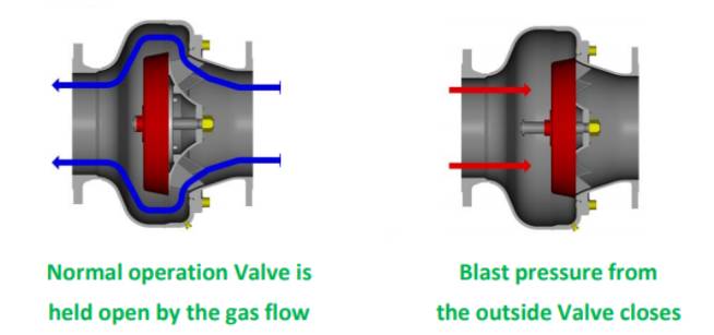 The exhaust blast valve comprises a special heat-resistant steel pressure disk mounted on a stainless-steel spindle within cast steel valve body and casing. The valve disk is held open by the gas flow and closes in response to the blast load.